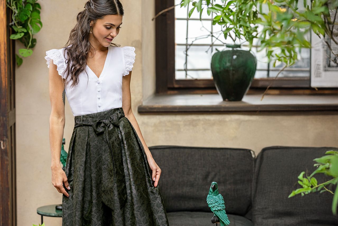 Ein Trachtenrock oder klassischer Tellerrock ist im Winter ein echtes Statement-Piece. In schweren Qualitäten wie Wolltuch, Cord oder Tweed getragen, wirkt er zugleich feminin und kraftvoll. Die weite Form bringt Bewegung in den Look und lässt sich überraschend vielseitig kombinieren: mit grobem Strick, mit einer feinen Trachtenbluse oder ganz modern mit einem Trachtenbody.