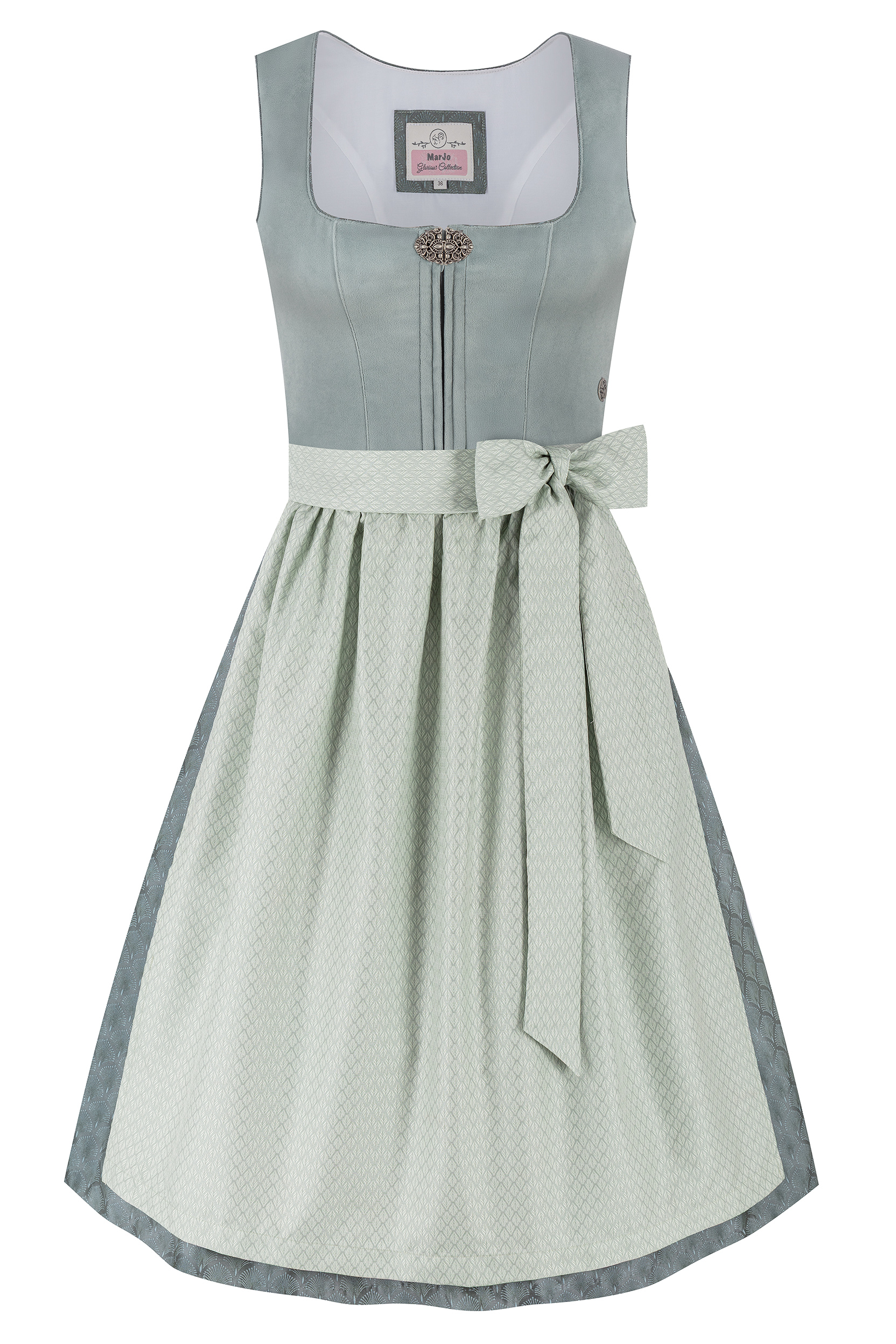 Dirndl FRIEDA setzt auf festliche Eleganz in Mint und Salbei. Das Mieder aus weichem Samt schmiegt sich angenehm an und ist vorne am Reißverschluss mit einer altsilbernen Schmuckbrosche verziert. Der schimmernde Rock mit elegantem Brokatmuster und die floral gemusterte Dirndlschürze aus Taft runden das Outfit stilvoll ab.