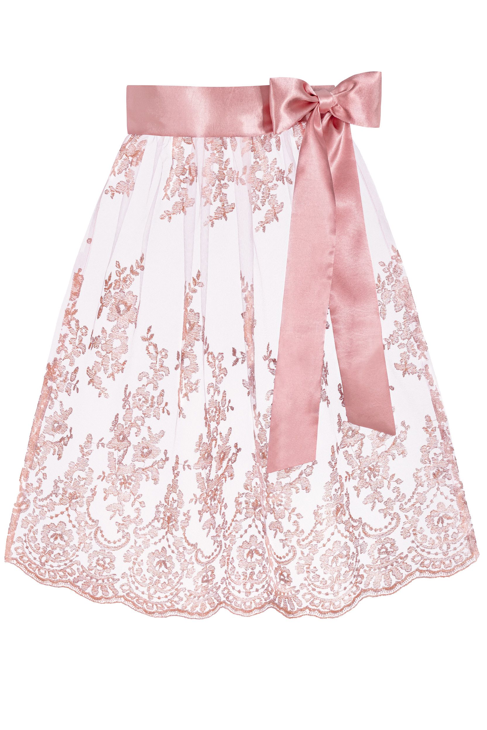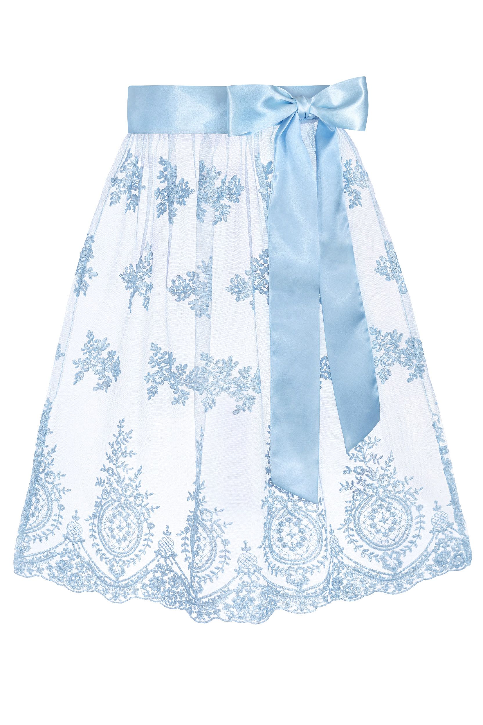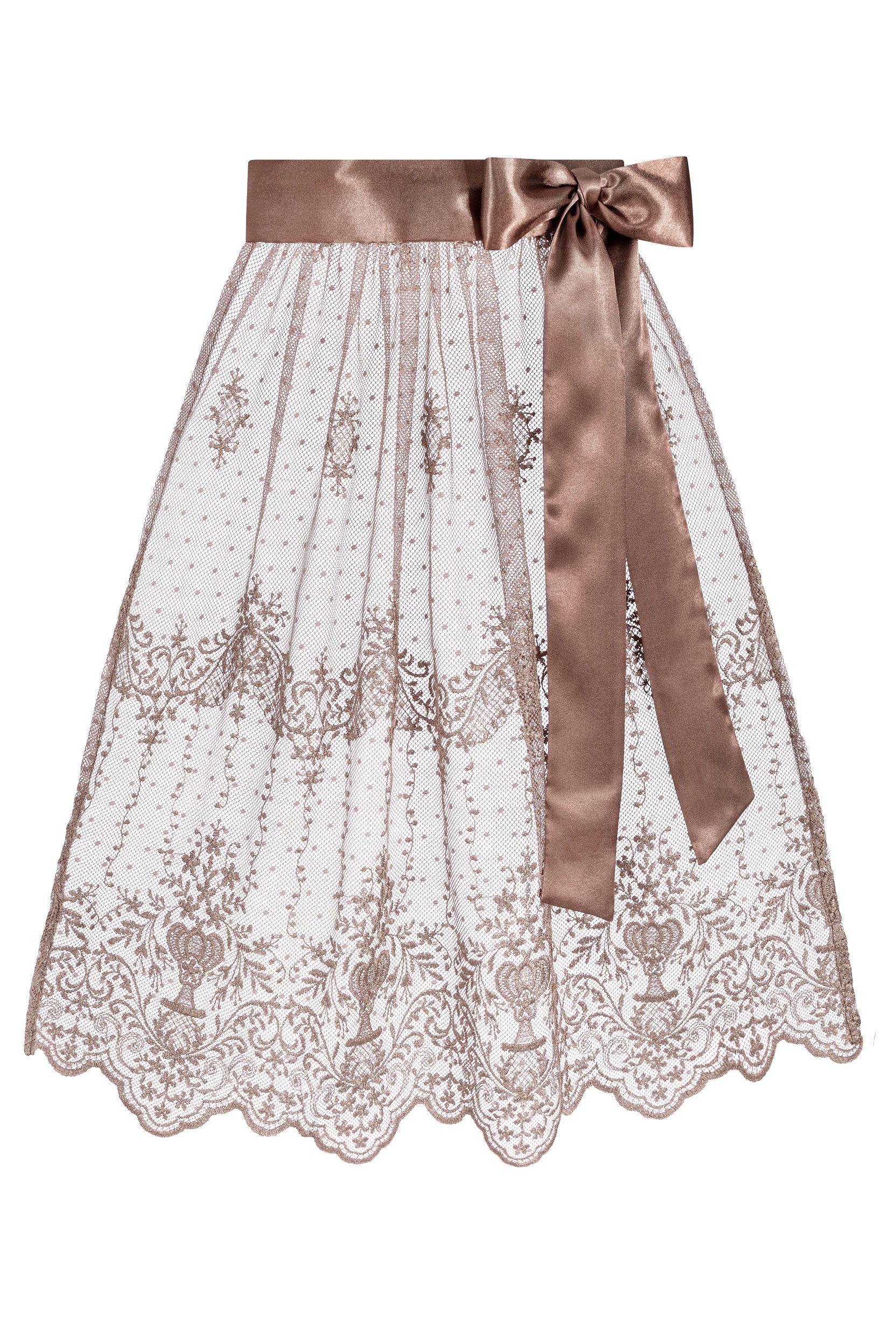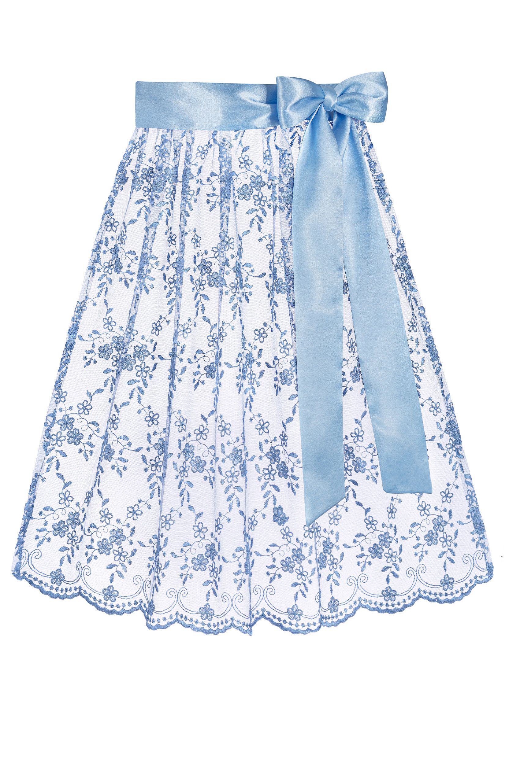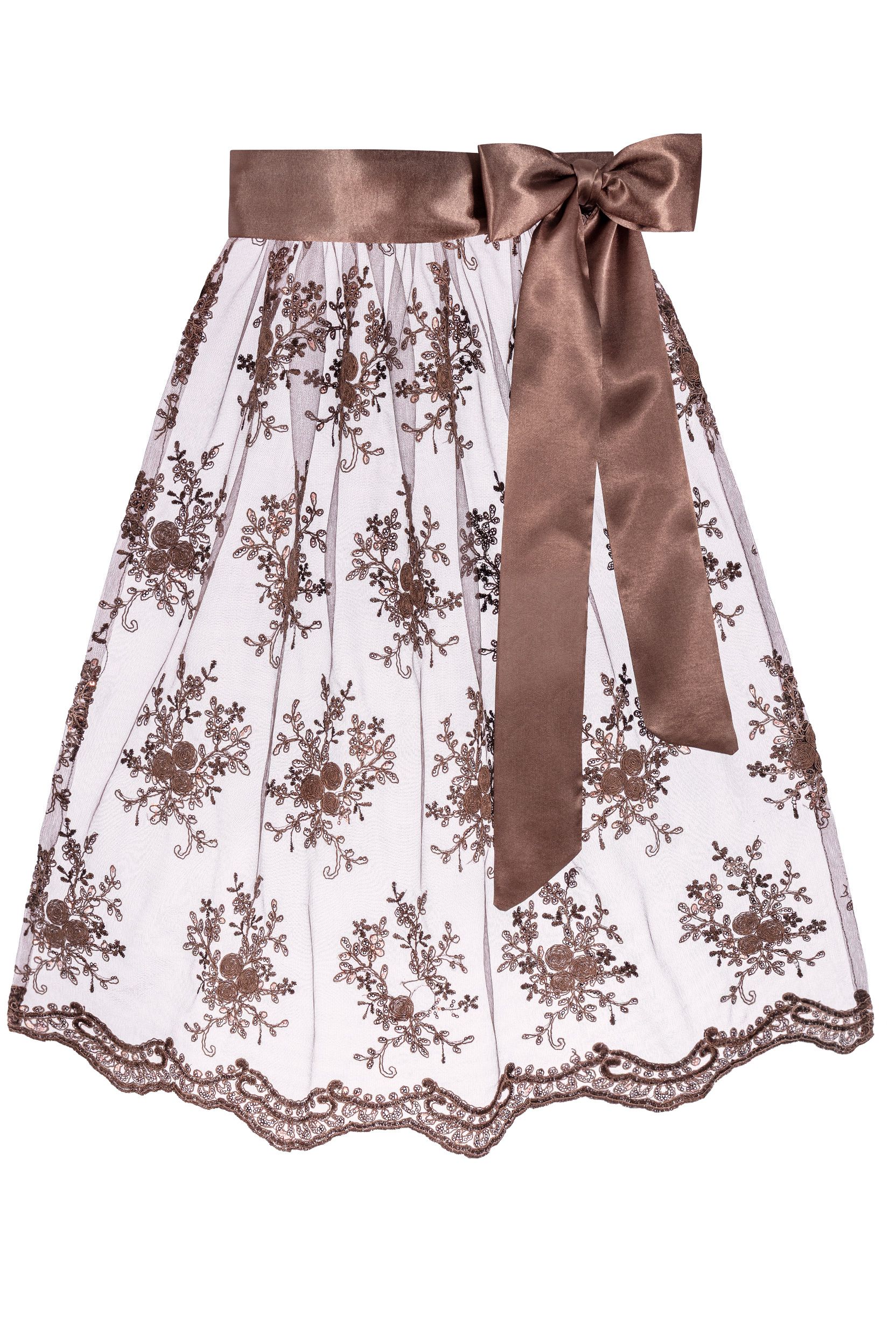 - Two-layered midi Dirndl aprons adorned with embroidery, sequins, and elegant hem stitching